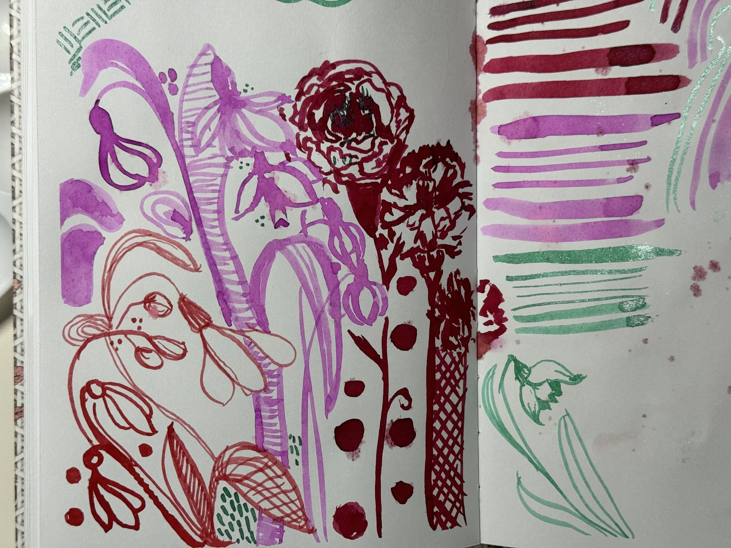 I woke up early in the morning and was so groggy, but since I have the inks all laid out…..No excuse. With the palette set out, I am now able to use up all the inks without wasting it. Since it is January, I decided to draw some flowers specifically snowdrops and carnation.