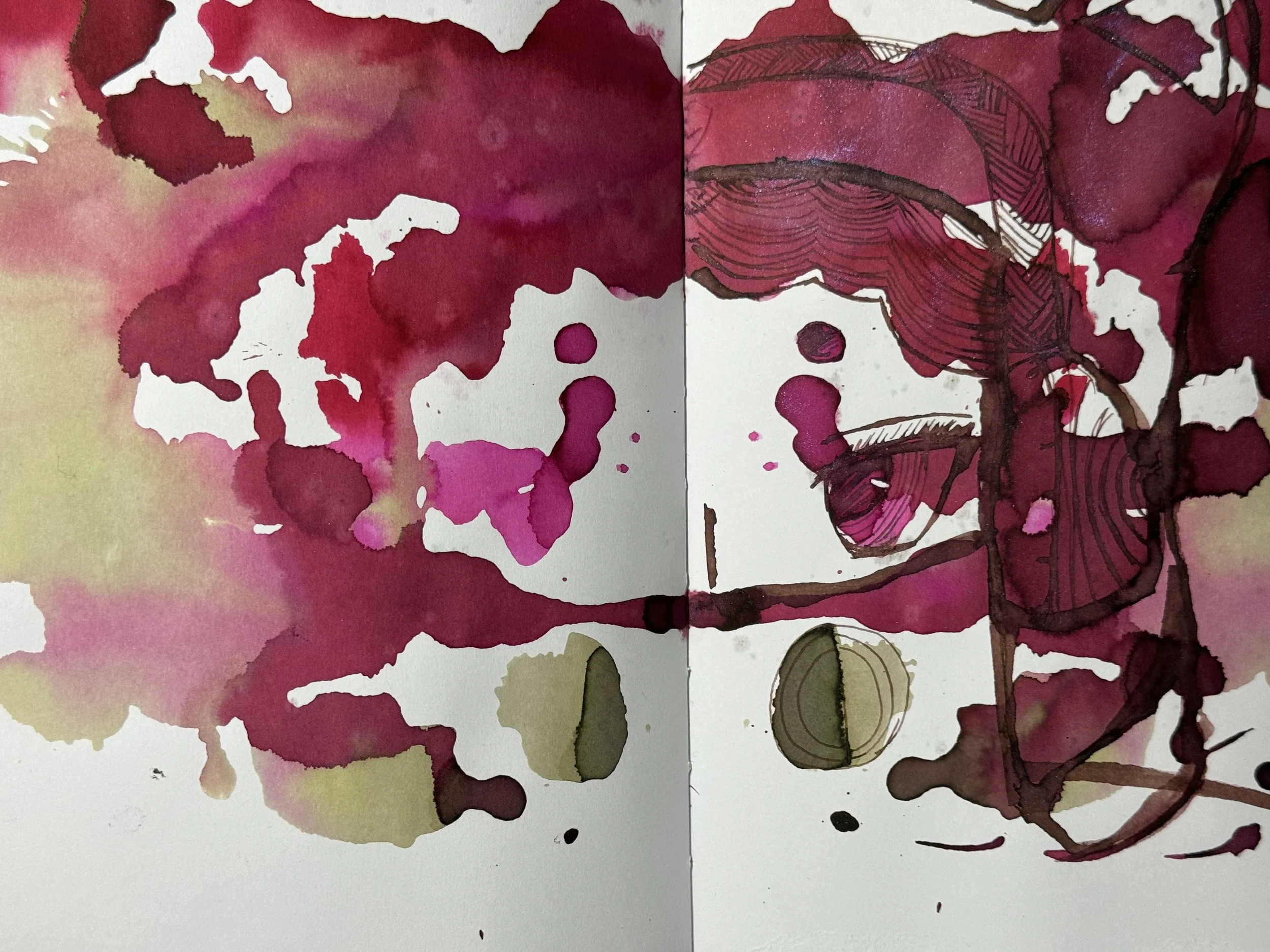 After working on piece that was meant for 2023 inktober, I reuse the inks leftover to create an organic shape where I try to outline what I see in the drawing. It is similar to looking at the sky and see shapes made by clouds. I decided to draw only one side of it which allows me to meditate for about 15-20 minutes. It is also to keep track of the before and after effects.